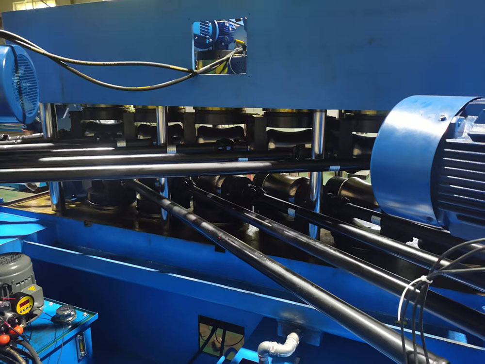 The twelve rollers of this machine are arranged in a 2-2-2-2-2 configuration, driven by a universal joint after being reduced by a motor through a gear distribution box. Twelve straightening rollers are arranged horizontally in two rows, with the axis of the straightening rollers rotating at a certain angle to the straightening center line. The pipe undergoes linear and rotational motion along the straightening center line between the upper and lower rollers, thereby crushing and bending any surface of the pipe.